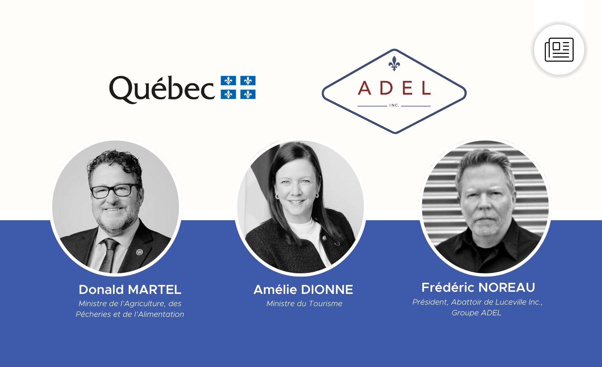 « En appuyant l’Abattoir de Luceville, notre gouvernement démontre sa volonté de protéger la capacité d’abattage et de transformation au Québec, tout en soutenant directement les producteurs et les éleveurs de la Gaspésie et du Bas-Saint-Laurent. Cet apport gouvernemental est important, mais il est également crucial que nos producteurs et éleveurs collaborent avec cette entreprise régionale. C’est un investissement stratégique pour garantir la continuité et la stabilité des chaînes d’approvisionnement locales, favoriser le développement de nouveaux marchés ainsi que contribuer au maintien et à la création d’emplois spécialisés dans la transformation des viandes. Notre gouvernement répond encore une fois présent pour nos régions. » – Donald Martel, ministre de l’Agriculture, des Pêcheries et de l’Alimentation et ministre responsable de la région du Centre-du-Québec
